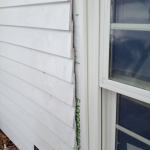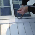 A bead of low-temperature caulk is squeezed in over the backer rod. Manny then smooths out the bead with his finger. Note that the joint between the siding and the window trim has also been caulked.