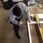 Before nailing the top corners, Manny checks the diagonal measur…