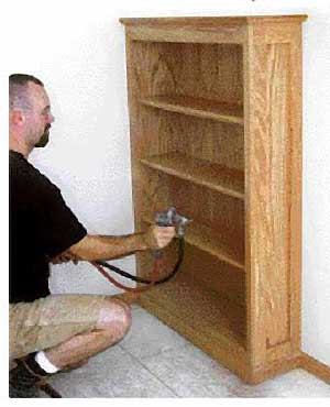 Cleanup. With only water as the primary flushing agent for the gun and lines, cleanup is a complete snap. First, I rinse out the pot by hand; then I fill it with clean water and run that through the lines and gun into a bucket until I see the spray run clear. Next I run denatured alcohol through the lines after flushing, to remove residual water and dry them out. I learned the hard way not to slack off on this routine: If you don’t get all the lacquer out of the system, and the equipment then sits idle for a couple of months, the residue turns to an orange gunk that clogs the gun. I have spent probably a couple of hours with Q-tips, pipe cleaners, dental picks, and lots of methyl ethyl ketone cleaning the stuff out. But if you really flush the lines and gun thoroughly, water is all it takes.