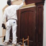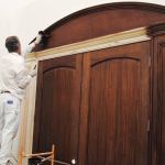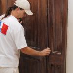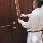 I typically spray three or four coats of lacquer, allowing 30 to 40 minutes drying time between coats. After each coat except the last, I go over the trim lightly with a fine sanding block to knock down any light fuzz or smooth out splotches in the finish. Since this finish is for interiors only, I finished the exterior door surfaces with several coats of brushed-on McCloskey Man O’War spar marine varnish (877/825-7727, valsparglobal.com).