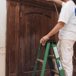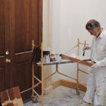 Gary and his crew generally do a good job of sanding their trim before I return to the job site to paint, typically finishing up with a random orbit sander and 80- to 100-grit paper. However, that’s still not quite fine enough for me, so I always go over the trim by hand with 120- to 150-grit paper. As I sand, I double-check for excess glue and glue marks, which will interfere with the finish.