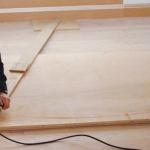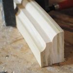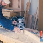 I then profiled the blanks separately and combined them to make one large piece of trim. The flat top cap measures about 5/16 inch thick and has a square edge, while the other two laminations measure about 13/16 inch thick. I cut the profile on the middle section with a 3/4-inch roundover bit and used a 5/8-inch cove bit to cut the profile on the lower section. Since I oversized each section, the bearing on my router bit had plenty of clearance while I profiled each piece; to prevent the router from tipping, I screwed a block of wood to the router base. I also profiled short sections of matching straight material to use for the mitered returns. When installing the three-part molding, I started with the middle section, then fit the bottom and top sections and added the returns. Finally, I added the transitional molding, a combination of 1 1/16-inch-by-2 1/8-inch and 3/8-inch-by-1/2-inch panel mold profiles, to hide the joint between the casing trim and the plywood.
