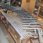 To look right, the crown molding capping the pediment needed to have a beefy profile. I don’t have a shaper or molder that could accommodate the size I wanted, so I strip-laminated three wide curved blanks in thicknesses that could be profiled with a router, then assembled them into a built-up crown. Using 3/16-inch poplar strips 2 1/2 inches wide, I glued up the three blanks at the same time, separating the individual blanks with dry joints and tightening the radius slightly to allow for springback.