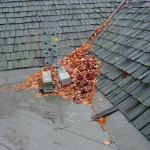 At the roof transition shown in the lead photo to the slideshow above, roofers had installed peel-and-stick over the EPDM lap. They had the right idea, but the peel-and-stick they used was rubberized asphalt, which reacts with EPDM. They also didn’t overlap the two membranes enough, so it wouldn’t have been long before a significant leak developed along the entire length of the overlap.
