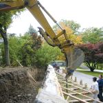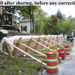 Our plan for saving the wall had two stages. First, we’d stabilize it in its current position with a bombproof system of posts, plank shoring, and diagonal braces. The shoring would prevent the wall from toppling while we excavated behind it, and later serve to distribute the pressure that we’d bring to bear against the wall to return it to an upright position.