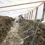 Cost breakdown. This job required a lot of man-hours. Labor costs came to $19,000. The helical anchors cost $7,000, and machinery and trucking added another $3,200. The insulation contractor charged $1,500 to foam the space between the stone and the shoring. The cost of materials – hardware, masonry supplies, drainage materials, and lumber – came to another $3,500, bringing the total project cost to $34,200.