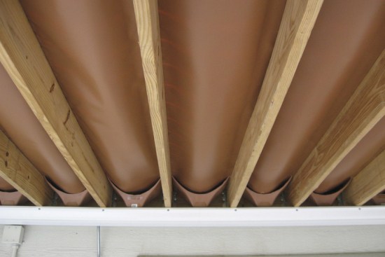 Rubberized membrane pieces are stapled to the top of the joists and shaped to hang lower at one end of the joist bay to facilitate drainage.
