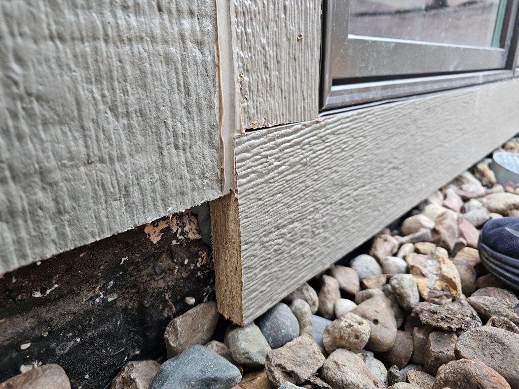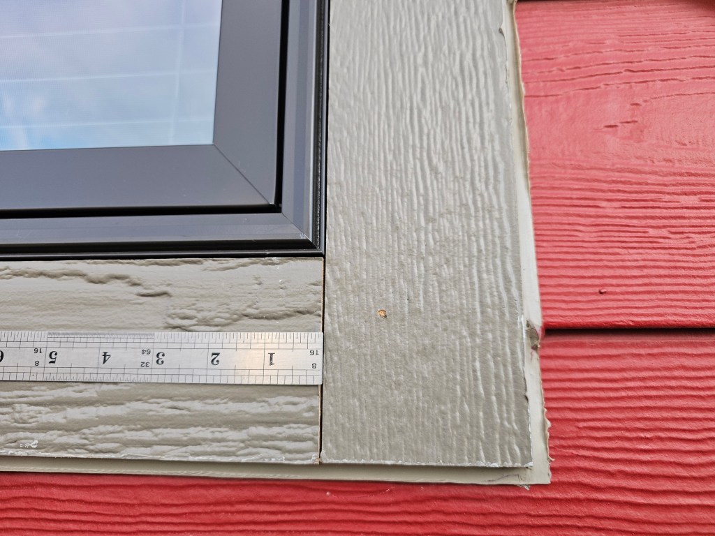 The original windows had been wrapped at the exterior with fiber-cement trim stock. For the new windows, the installer used prefinished LP SmartSide Trim. This trim had to be ripped in width to fit the space between the window frames and the existing siding, and I am reasonably sure the window contractor chose LP SmartSide, which is an engineered wood product similar to OSB, because it is easier to cut and rip than fiber cement. But the contractor failed to meet the installation requirements of either LP or Pella. These were the two most egregious mistakes: