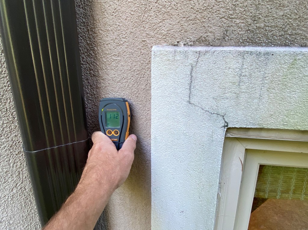 Another house had a plastic track installed at the bottom of the EIFS. The weeps in the track were the outlet for the drain channels on the walls, but the small weep holes were blocked by caulking installed between the track and additional EIFS installed on the foundation wall below. Water soaked into the sheathing in the area of the track.
