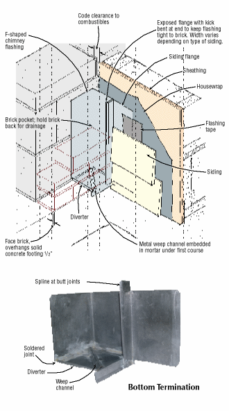 A. Fred Seifert responds: I bend an F-shaped piece of flashing that catches the ends of the bricks where they meet the house (see sketch). I use copper, lead-coated copper, or aluminum and bend the flashing in long pieces on an 8-foot brake. We nail the flashing to the sheathing over the housewrap, then use a flashing tape to seal the outside leg of the flashing to the wrap. The mason spaces the brick away from the flashing so that any water that gets in can drain down and out the bottom through metal weep channels embedded in the mortar under the first course of brick.