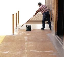 When Dan and Rick show up on site, they bring with them the second layer of plywood for the deck. They use 1/2-inch AC fir plywood, which provides a smooth surface for the resin to adhere to (Figure 2). Figure 2. On the day the fiberglass will be applied, a clean, dry layer of 1/2-inch AC plywood is laid over the base layer of 3/4-inch T&G plywood. Joints are staggered and the sheets are fastened with 8d ring-shank nails. They prefer to provide the plywood because they can be sure of the moisture content of the wood. Moisture is probably the biggest problem at this stage of the game. The resin does not soak into the wood very well, so any moisture in the pores of the wood prevents the resin from penetrating and destroys the bond. The key is to never install more plywood than can be covered with fiberglass in a day’s work: Two experienced workers can cover about 600 square feet in a day. Joints in the second layer are staggered over those of the first. The two layers of plywood are not glued together; they’re only nailed with 8-penny ring-shanks, 6 inches on-center at the joists and 4 inches on-center at the edges. This makes it easy to remove the top layer of plywood if there is a problem down the road.