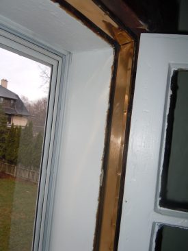 Spring bronze is installed with the flat side on the interior and the sprung side facing the exterior so that the sash compacts the bronze as it closes. Here it has been installed on an inward-opening casement window.