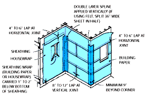 Any sheathing wrap should be applied from the bottom up. The wide overlaps shown here are recommended for coastal regions where increased wind pressures can pull water uphill, allowing it to leak past a narrow overlap.
