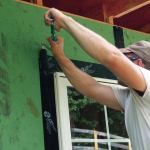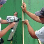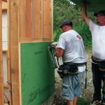 Installation. We used 1 1/2- by 1 1/2-inch PT spacers as stand-offs to help put up the panels. A full sheet is fairly light, but it’s a two-man job install, especially at the outside corners where the panels lap each other. We took time to square them up properly. It’s important to orient panels the same way and to work in one direction because the foam overhangs the OSB slightly on one long and one short edge to ensure proper gapping. In a few places, we installed panels horizontally to save material; this meant adding horizontal blocking for edge fasteners.