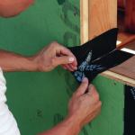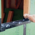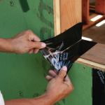 For the windows, we set up a mobile cutting station to cut tape for the head, jamb flashing, and the four-piece pan. We started at the pan flashing, using Zip System’s corner/valley tool to set 9-inch lengths of 6-inch tape in the corners, with 3 inches on the sill and running up the trimmer, and the 9-inch dimension flush with the inner edge of the 7-inch–deep sill. This left 2 inches overhanging the sheathing, which we stretched and pressed onto the panel face. This doesn’t always work perfectly, but corner flashing gets covered with the next couple of pieces, plus sealant under the window’s nailing fins.