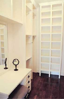 In addition to adjustable shelves and closet rods, most customers want custom features and accessories. I usually apply moldings and paint to match other woodwork in the house, and I often install cedar closet liner in some of the compartments, gluing it up right over the drywall. Large three-part mirrors (which should be planned for in the layout stage) are another popular option.