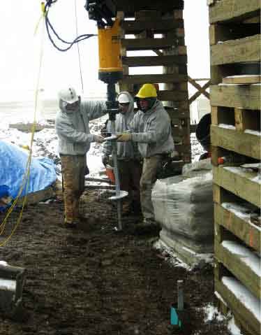 So for this job we decided to use helical piers, which looked to be an ideal solution because they require no excavation and can be driven quickly even in tight quarters (see “Helical Pier Foundations for Problem Sites,” 5/04). We obtained certification in the Chance Helical Pier Foundation System (573/682-8414, www.abchance.com) and purchased the equipment needed for installation, which included a hydraulic auger adapted to our excavator’s boom and a computerized torque meter. Altogether, it cost around $8,000.