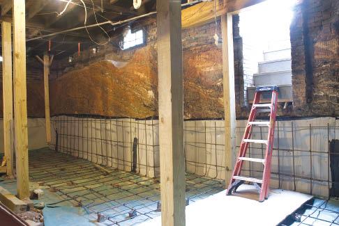 Waterproofing. Although the 80-year-old house had no perimeter footing drain, the basement had stayed dry; as we removed soil, we found no evidence of moisture. Still, we wanted to make absolutely sure that any dampness in the soil couldn’t come in contact with the new concrete foundation walls or the bottom of the slab. Since the sides of the excavation would serve as the outside form for the foundation walls, we lined the dirt with MiraDrain 6200 (Carlisle Coatings & Waterproofing, 888/229-0199, www.carlisle-ccw.com), a dimpled drainage membrane that allows water to move freely through it. At the base of the excavation, we installed MiraDrain HC, a 1-inch-thick by 6-inch-high perimeter drain that collects any water at the base of the foundation wall and directs it to sump baskets located in the egress window wells, where it’s pumped out to grade.