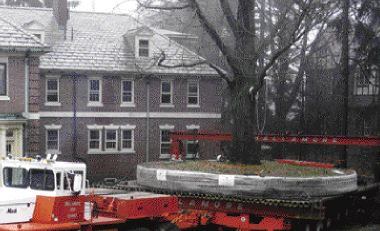 The exposed root mat was wrapped in several layers of burlap and wire mesh, and closely spaced steel pipes were driven horizontally beneath it to create the structural “floor” that would support the 450,000-pound weight of tree and soil. Finally, a system of steel I-beams, hydraulic jacks, and a powerful crane were used to ease the tree onto a flatbed trailer for the move to its new home, 100 yards away.