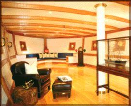 Compound-curved framing converted foundation walls into a ship’s hold, complete with bow-berth seating and eight brass portholes, each featuring a backlit oil painting with an ocean theme. Mahogany trim and beams outline beaded and painted pine hull planking on the room’s ceiling and walls; a “deck” of clear-finished fir gleams underfoot. The hold is accessed by a mahogany ship’s ladder with polished brass handrails and stainless steel cable stays. Concealed behind built-in stowage, a 28-by-48-inch plasma screen provides an ideal port for viewing “Mutiny on the Bounty,” “Master and Commander,” or even “Gilligan’s Island.”