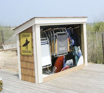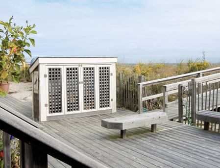Patty McDaniel of Boardwalk Builders in Rehoboth Beach, Del., put the little storage building at the intersection of the deck and the boardwalk that leads out to the ocean — “right where everyone dumps their stuff when they come back from the beach. Only now, they have a place to put it.”