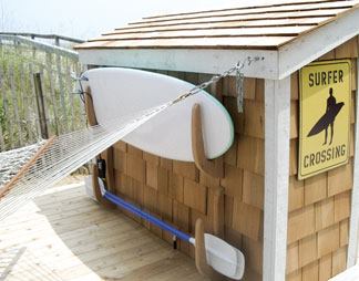 The shed is partially sunk below the level of the deck. “Part of the challenge was to make it look small but still hold a lot,” says McDaniel. “We wanted to provide as much storage as possible without putting a humongous outbuilding right in the ocean view. We gained about 30 inches down there. It’s a little damp in the bottom, so that’s where they put the boogie boards.”