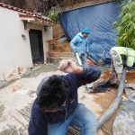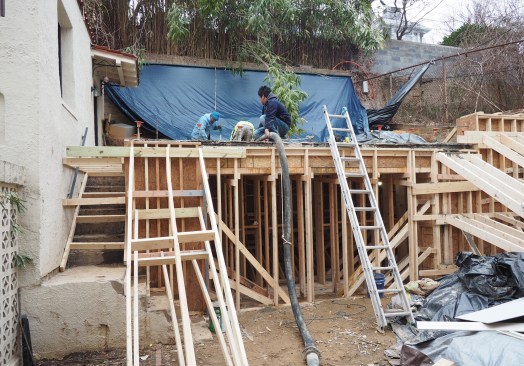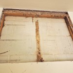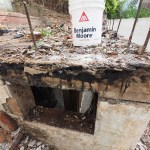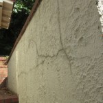 The interior of the building was in poor condition, and we stripped the drywall as part of the planned renovation. In addition to revealing an impressive termite situation, we found large cracks in the 12-inch-thick, reinforced block wall, which made it seem that the building was being pushed down the hill. (The top of the front wall was pushed out significantly as if the upper slab had been pushed down the hill a few inches and had broken the stucco on the front).