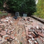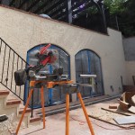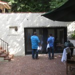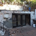 Additional concrete work. The structure’s downhill “front” wall was also in poor shape. In addition, the clients wanted to change the style of exterior doors from sliders to a set of arch-top double doors, so we removed all the concrete block on the fourth side of the structure. We poured a reinforced concrete knee wall on top of the upper patio slab to support a new brick-veneer parapet and poured a reinforced concrete beam below the slab to square up the opening. (The door’s arch-top rough openings were later framed out with 2-by stock and a stucco finish was applied to the front façade).