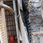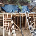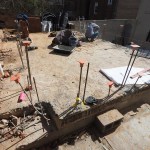 Concrete “liner” wall. For the 6-inch-thick concrete liner wall, we installed the required rebar in front of the waterproofing, then formwork inboard of that. The engineer had cleverly called for holes to be drilled 3-feet on-center in the existing upper patio’s 7-inch-thick concrete slab, so we had easy access to pour the concrete from the top of the wall.