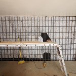 We used the same drain board we use on many projects, a dimpled sheet of heavy, semi-rigid plastic that creates a space for water to easily move down through. We faced the dimple side out in this case, toward the block walls, making a 3/8-inch space at the face of the CMU. The Mel-Drain dimple sheet is available with or without a filter fabric facing, and for this application, we opted to use it unfaced (we use the fabric version only when dirt will be against it, as on the outside of the walls, but in this application, it was sandwiched between two masonry walls).