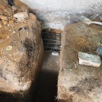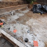 Blind-side drainage. Our last task was to connect the drainpipes we installed through the wall to an acceptable outlet for any water that comes down the wall. We had left the existing floor slab in place; it made for easier working compared with gravel or mud, and, in fact, we attached the wall formwork to it. Following the plan created by the engineer, we channeled across the slab in two places, exposing the two 3-inch PVC pipes we had cast into the wall. These connected the wet side of the drain board to the below-slab gravel area; we tied new pipes to them to run out the front side of the building and out to the surface as the grade drops off.