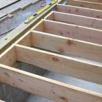Floor framing. Before framing the floor, we cut an access opening into the existing crawlspace, then used 3/8-inch-diameter bolts to fasten a 2×10 ledger to both the existing double sill and the block wall underneath. The joists are attached to the ledger with hangers. At the other end, they’re nailed to the 2×4 PT sill, which we fastened to the masonry ledge with powder-actuated fasteners. Blocking between the joists over the sill substitutes for a continuous rim joist. To finish up the deck, we glued and nailed down a 3/4-inch T&G plywood subfloor.
