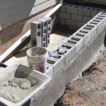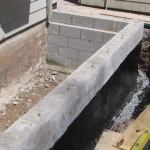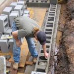 After the concrete has cured at least a day and we’ve stripped the forms, we move the blocks down into the hole, setting them up on sheets of plywood to keep them clean. This job was simple to lay out: We snapped a chalk line on top of the footing parallel to the existing foundation wall to represent the outside edge of the new wall, squared up the outside corners, and started laying block.