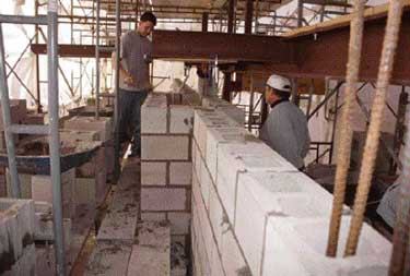 The blockwork was on the critical path; the floor and roof framing could not be completed without it in place. After we built one wall to the next floor height, we removed our scaffolding to allow floor framing to proceed. Meanwhile, we moved to work on the other gable. We started work in the middle of winter and ultimately performed about half of this job under winter conditions.