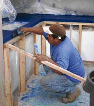 We typically need to remove doors or drawer fronts to install the shelf. Before starting, we use blue tape and plastic to mask the cabinets and nearby walls. If there’s a finished floor, we’ll protect it, too. We cover the plywood top and adjoining walls and cabinets with Kraft building paper. This prevents them from absorbing excess moisture or wicking color from the wet concrete.