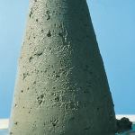 On site, the accepted way to gauge and control water content is the slump test. To do the test properly, use a standard cone 12 inches high, 4 inches wide at the small end, and 8 inches wide at the big end. You fill the cone up about 1/3 full, rod it 25 times, fill it up to 2/3 full, rod it 25 more times, and then finally fill it to the top and rod it again. Then you remove the cone and measure the slump from the top down. This picture shows a 9-3/4-inch-slump concrete – a very pourable concrete.