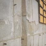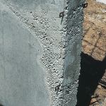 Now, you can do a good job with very flowable concrete if you move the chute and puddle the concrete where it is intended to be. But if you dump a whole lot in one corner and then pull it along the form with hoes, the aggregate starts coming out of the flow and separating from the cement. Where there’s a lot of gravel in one place and not enough cement, the result is honeycombing. A result like this usually means that someone tried to make the concrete flow too far. You can also see the results here as visible lines in the wall.