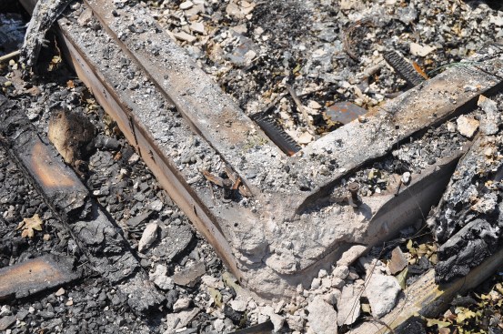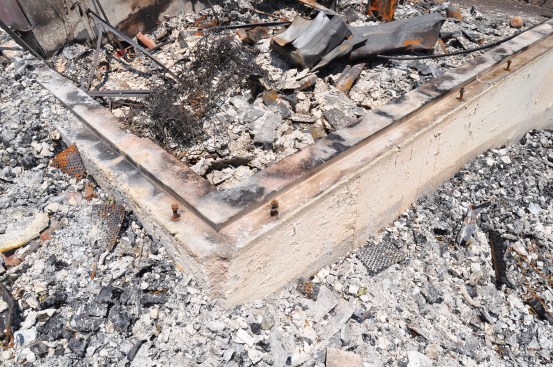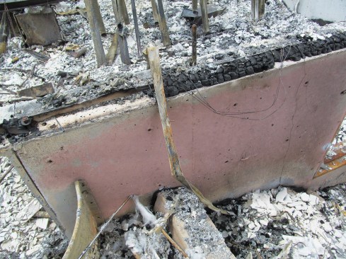 I have also evaluated concrete foundations that have been damaged by ordinary house fires and have always found that the concrete foundation becomes unusable where the structure is burned to ash without the benefit of being extinguished. In those cases where the heat is high for several hours, the exposed concrete becomes soft and powdery and can easily be broken apart with a framing hammer to reveal perfectly intact rebar (which, by the way, doesn’t melt in a fire).