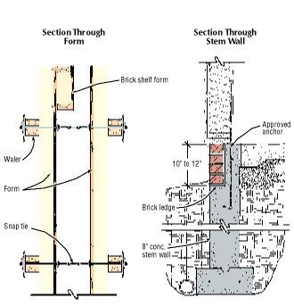 - Q. I’m planning to form a simple 4-foot stem wall foundation for a single-story garage using plywood, snap ties, and walers. It needs to have a brick ledge for the top 10 to 12 inches, which will show above grade. What’s a simple, effective way to do this? Should I transition from a 10-inch wall, or can I use an 8-inch wall and reduce the thickness at the top? Would rigid foam board make a good