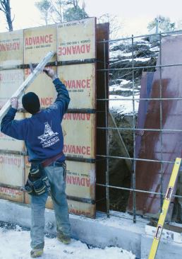 Because the garage foundation is essentially a filled container and the back is unsupported by the exterior grade, however, a 10-inch wall was required there. A retaining wall extends from its outside corner to ease the final grade around the structure; it’s tied to a reinforced spread footing.