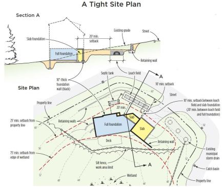 The local health code requires a minimum distance of 20 feet between the edge of a leach field and a full foundation or crawlspace, and the lot was too small to accommodate that much separation. The minimum distance between a leach field and a slab foundation, however, is only 10 feet. We realized that if we designed critical portions of the foundation to qualify as slab, we could obtain our building permit without needing a variance.