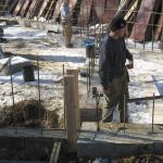 Forming the compartments. For the larger of the two slab compartments, we added the interior wall after we poured and stripped the forms from the main walls. We did this by drilling a series of 4-inch-deep by 3/4-inch holes into the existing wall on 16-inch centers, and installing #5 rebar pins using Red Head epoxy (800/348-3231, itw-redhead.com). The pins project the standard 2 feet from the wall, allowing for a solid connection between the interior and exterior walls. With the interior compartment walls in place, we were able to fill the compartments themselves with compacted soil. The capping slabs were poured flush with the top of the wall; the floor framing clears it by the thickness of the sill plates.