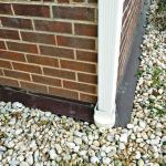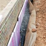 The inspector agreed to the plan, and actual construction went off almost without a hitch. We did have to do some fiddling to get the foam to lie neatly against the foundation in areas where the concrete was a bit rough, but this was a minor problem. We also lined the trench with filter fabric and installed a 4-inch drainpipe that ran to daylight, before backfilling with clean 1-inch stone. The upper edge of the foam finishes flush with the finish grade, where it’s capped with a strip of aluminum coil stock. The coil stock is caulked into a 1/2-inch slot ground into the mortar and fastened with nail-in lead anchors; it extends 8 inches underground.
