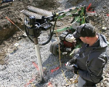Figure 10. Driving a helical pile in frozen ground begins with inserting a proprietary heating rod in a hole drilled with a rotary hammer (above). Once the ground is warmed, the pile is driven normally (right).Photo credit: Dave Northup