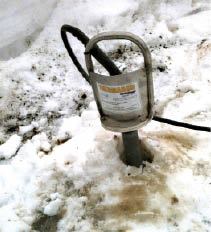 Load testing a helical pile is far simpler than it sounds. The height of the pile above grade is measured (left). Next, a cap is inserted into the pile to protect its top. This cap is slammed five times with a sledge hammer (right), and the pile’s height is measured again. The sledge’s weight is specific to the size of the pile – a heavier hammer is used with bigger piles. The amount that the pile sinks indicates the soil bearing capacity, which an engineer will verify. The dynamic loading imposed by an impact load is surprisingly large and correlates to the static load a pile can handle.
