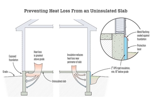 A: Steve Baczek, a residential architect from Reading, Mass., who specializes in building science, responds: Because the edge of the slab links directly to the cold outside air (via the uninsulated foundation), the surface temperatures of the floor and wall materials at the perimeter of the house will be cold as a result. Preventing warmth from escaping along the edge of the slab would greatly improve the floor temperature at the perimeter of the house, and applying a layer of insulation to the outside of the foundation is an excellent way to do this.
