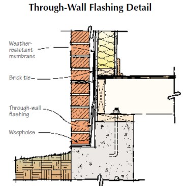 Through-wall flashing and weepholes direct water in the air space to the exterior.