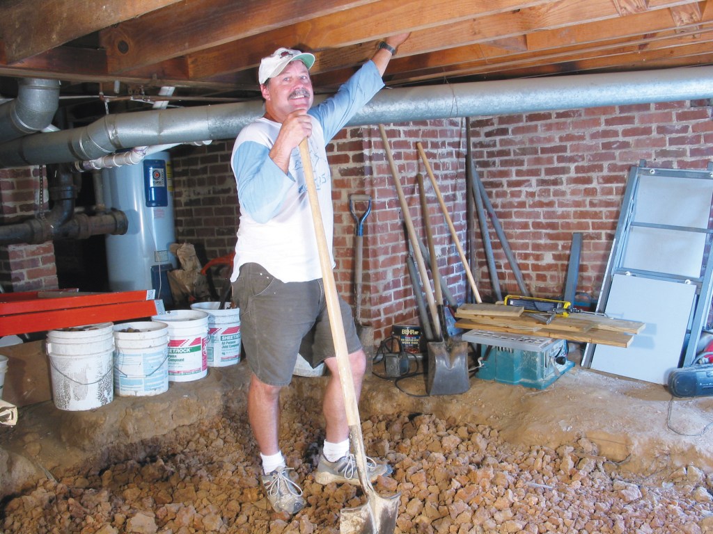 In 2002, I was storing tools in the lower end of my North Carolina home’s crawlspace. At the door, I could stand, stooped slightly, but the grade went up, and about 12 feet in, the headroom was about 4 1/2 feet. I decided to dig out a 12-by-16-foot section near the door so I could store and retrieve my tools without stooping. At the same time, I’d beef up my underbuilt 50-year-old foundation. Then, after digging down about 2 feet, it occurred to me that by going down a mere 24 inches more, I could have a very nice space, with a concrete floor and a full 8 feet from the top of the concrete to the bottom of the floor joists. I decided to go for it.