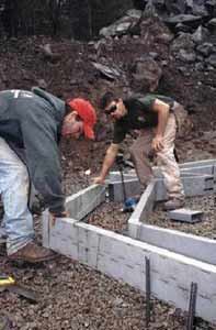 The first step in setting the forms is to stake the foundation corners and run strings between them. We measure off the string, 4 inches for the outside form and 12 for the inside form. Starting at one of the footing’s outside corners (usually the one with the two longest walls), we drive a couple of rebar pins into the ground, one at the inside and one at the outside of the corner.