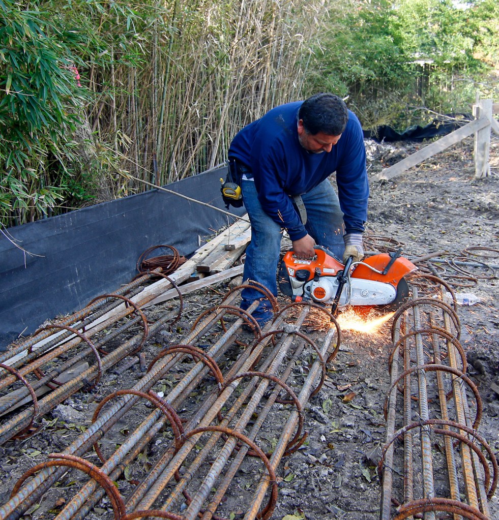 When pouring the concrete here, we needed a fairly loose mix so it would pour easily through the rebar cages without creating voids. We did not want to just water down the mix, though, but instead used a rich mix, carefully controlling the slump. The engineer was kept busy throughout the process, periodically evaluating each truckload of concrete.